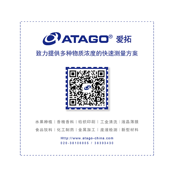 ATAGO(爱拓)源自日本,拥有超过75年研发与制造光电仪器的生产经验,不断运用折光法原理衍生出可测量多种物质浓度的折光仪,其中,以糖度计与盐度计得到最广泛的应用,仅需少量样品,即能快速测量多种物质的糖度(Brix值)及盐度(SALT)。产品性能卓越,专业可靠,耐用性超群,从原料加工,混合中间体,到成品检测,都能实现快速、稳定、专业检测,同时测量Brix值、折射率(nD)、盐浓度,为研发、生产、检测多个环节提供可靠的数据支撑与分析。